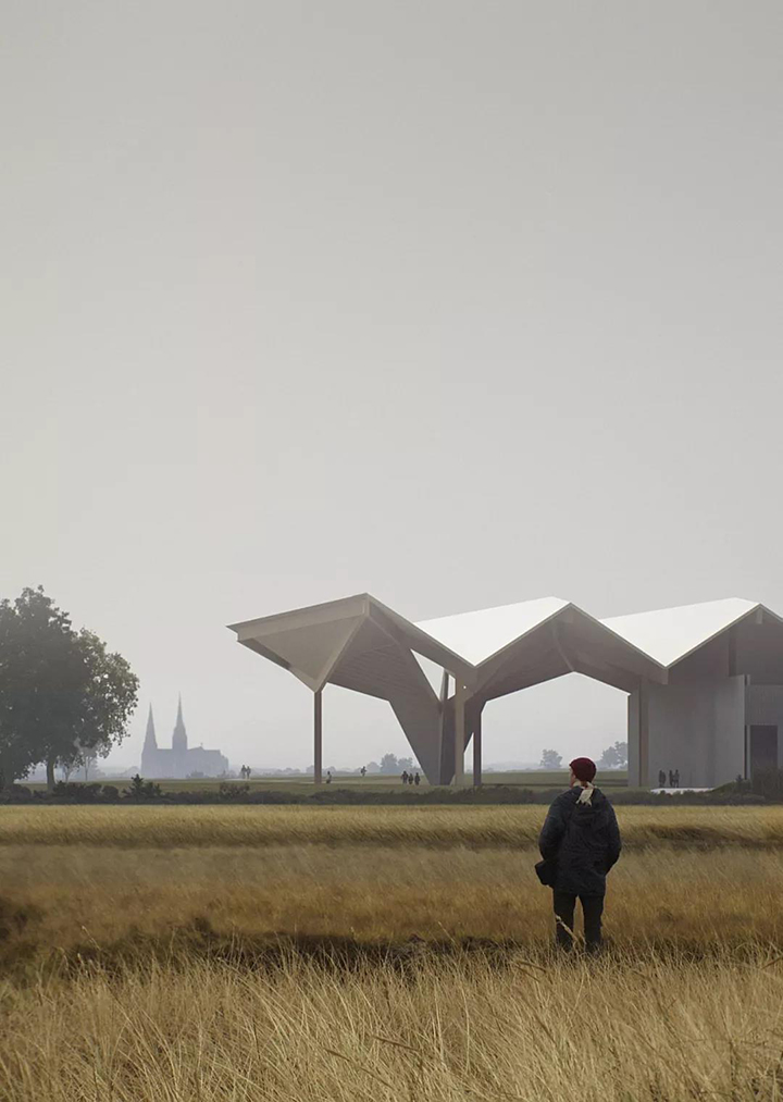 藤本壯介與CAAU合作的法國里爾大法院。后面這張鳥瞰和之前的又不一樣,MIR通過高超的后期技巧把藤本壯介的設(shè)計手法與當(dāng)?shù)氐淖匀画h(huán)境結(jié)合起來,從另一個維度詮釋了建筑與基地的親密關(guān)系,又不矯揉造作,MIR在官網(wǎng)上用法文給它起了個名字:恰似一片羽毛。