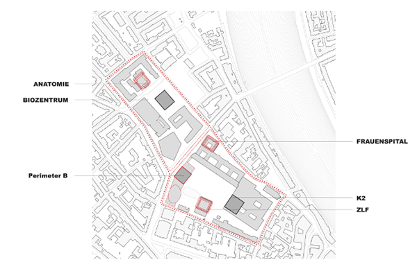 巴塞爾大學(xué)醫(yī)院坐落在建于13世紀(jì)的城墻內(nèi),身處舊城區(qū)的小規(guī)模建筑之中。與周邊城市街區(qū)環(huán)境相反,醫(yī)院在這個(gè)環(huán)境中是獨(dú)特的、單一的存在,整體環(huán)境建在數(shù)十年來(lái)一直圍繞在此處的城內(nèi)花園之中,這個(gè)花園曾經(jīng)是一個(gè)公園。將醫(yī)院設(shè)置在大學(xué)附近并提高其密度的決定吸引了教學(xué)、研究和治療領(lǐng)域的其他機(jī)構(gòu),例如蘇黎世聯(lián)邦理工學(xué)院。